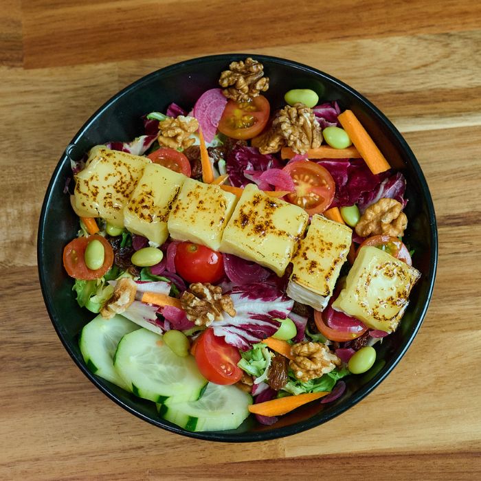 Mézclum, zanahoria, tomate cherry, cebolla roja, edamame, uvas pasas, queso de cabra, uva (sin semillas).