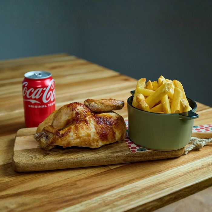 Combo 1: ½ pollo + ½ ensalada sencilla + ½ patatas + bebida lata