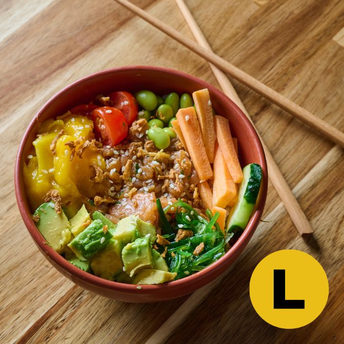 Arroz, salmón, edamame, pepino, aguacate, mango, wakame, cebolla frita, cebollino, sésamo.