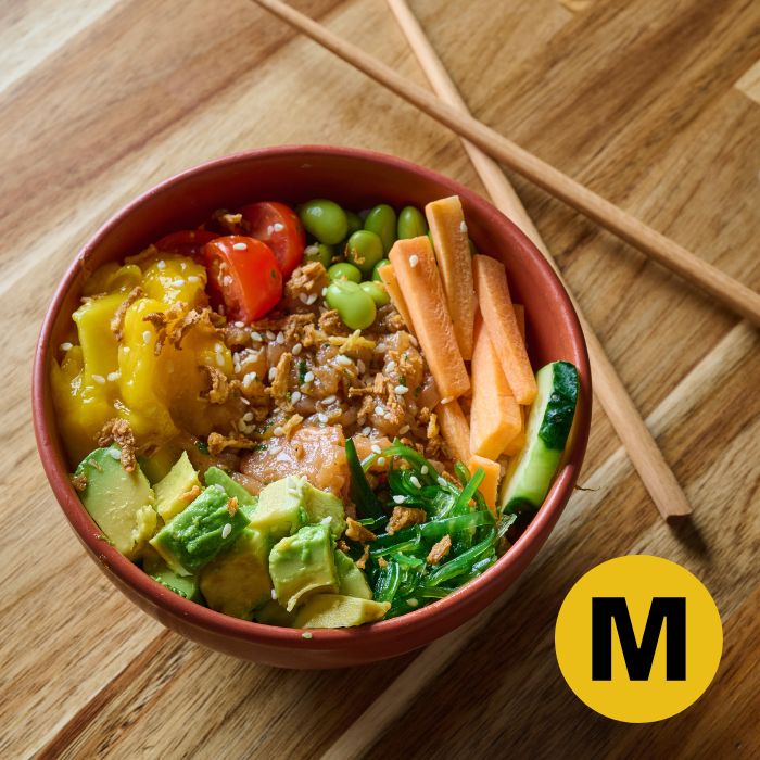Arroz, salmón, edamame, pepino, aguacate, mango, wakame, cebolla frita, cebollino, sésamo.